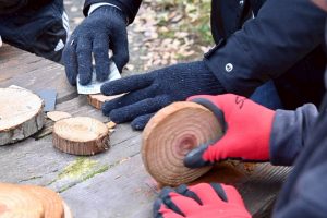 東横建設は、2024年より神奈川県の森林再生パートナー制度に参画しており、森林再生パートナー活動は今年度が初の実施となります。今回はインストラクターの指導のもと、間伐や枝打ち、間伐材を使用したコースター作りを行い、社員とその家族計15名が参加しました。
