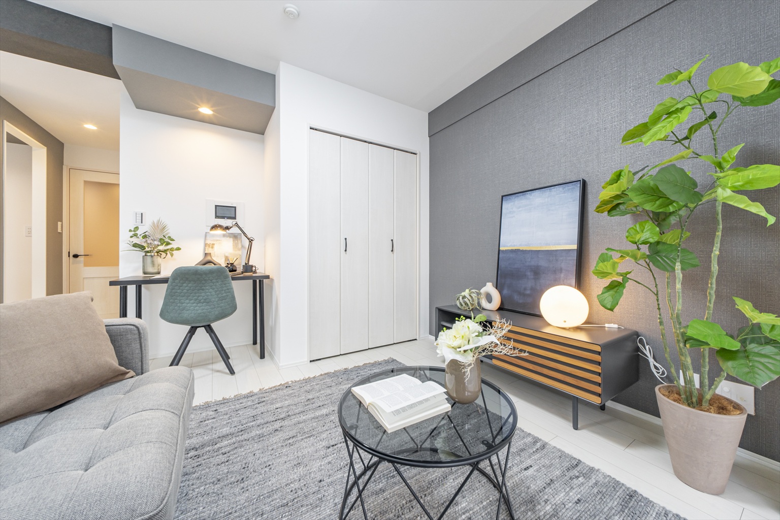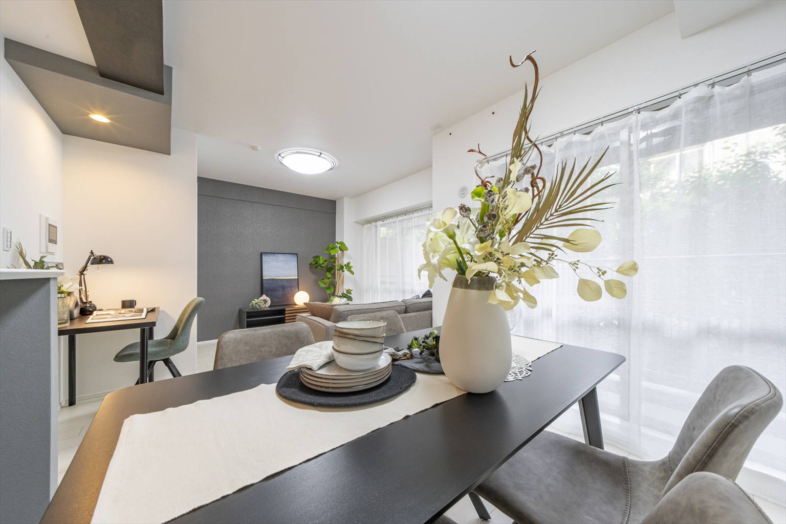 メリハリのあるカラーリングが映える開放的なリビング